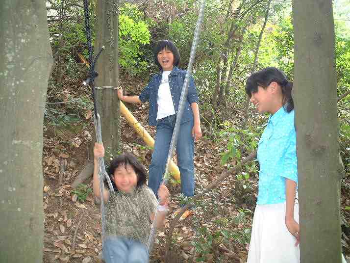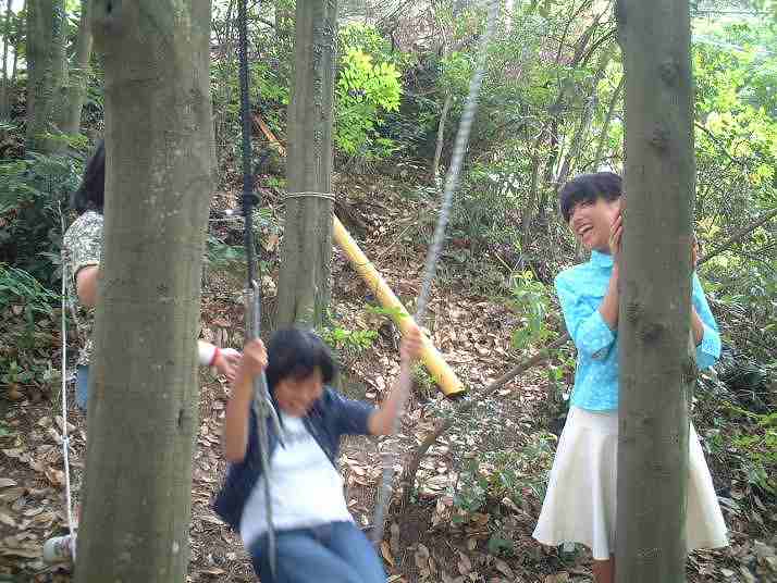 まずは空中ブランコで肝試し。土曜日の山に歓声が響いて大騒ぎ。まいは「高所恐怖症で、スペースワールドでもジェットコースタようのらんかったんよ」と主張。
