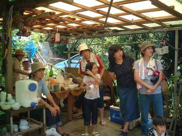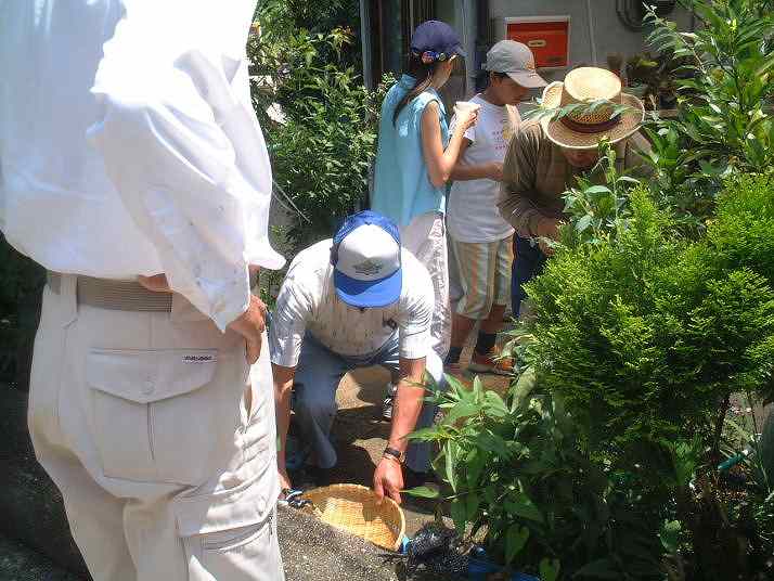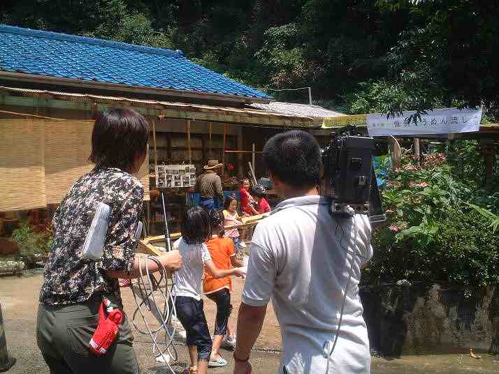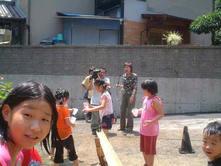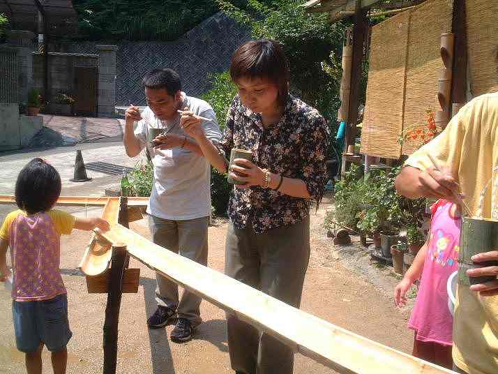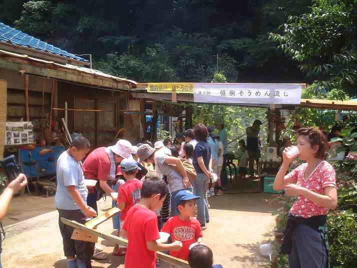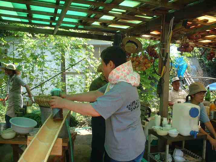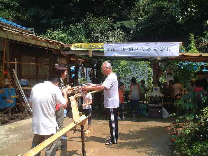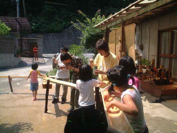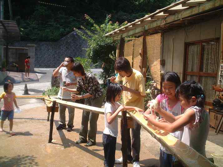 そうめんを流すのは子供たち。そうめんがつまると 手でつかんで運ぶのは いったいだれだ。(左1)
