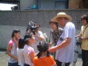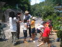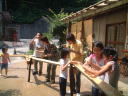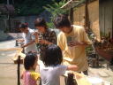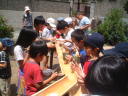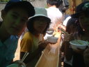 2曲がり目の水流にむらがる2,3,4年生。お箸の使い方は俊敏。あっという間に自分のお椀にいれて ペロリ。 |