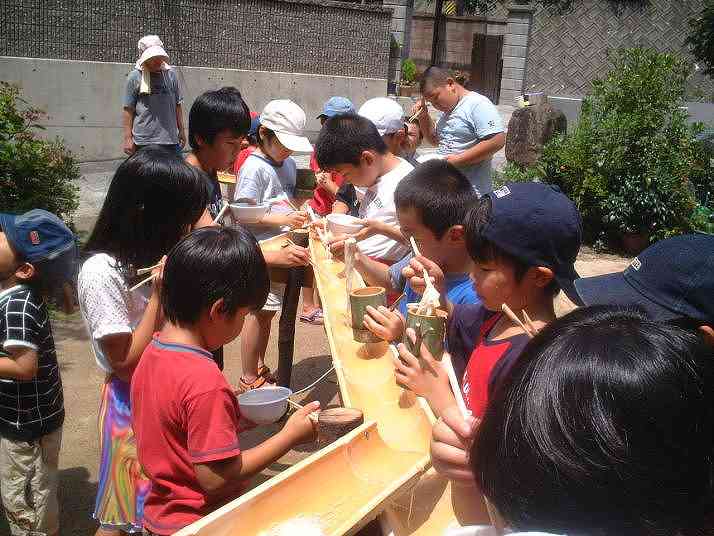 そうめん流しは、ますます人気が出てきました。あつまった子供、2歳〜小学6年生