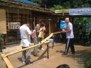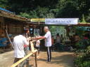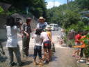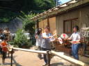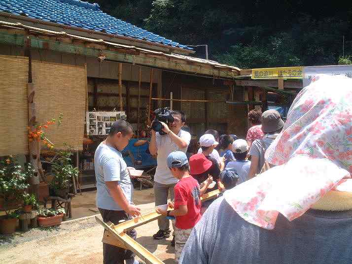 そうめん流しの水流は、去年の2曲がりにたいして、今年は4曲がり。それぞれの水流にたくさんのひとがお箸をもって並ぶことができました。発案は、小西のおじちゃんと郷田のおじちゃん。