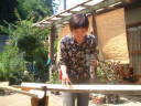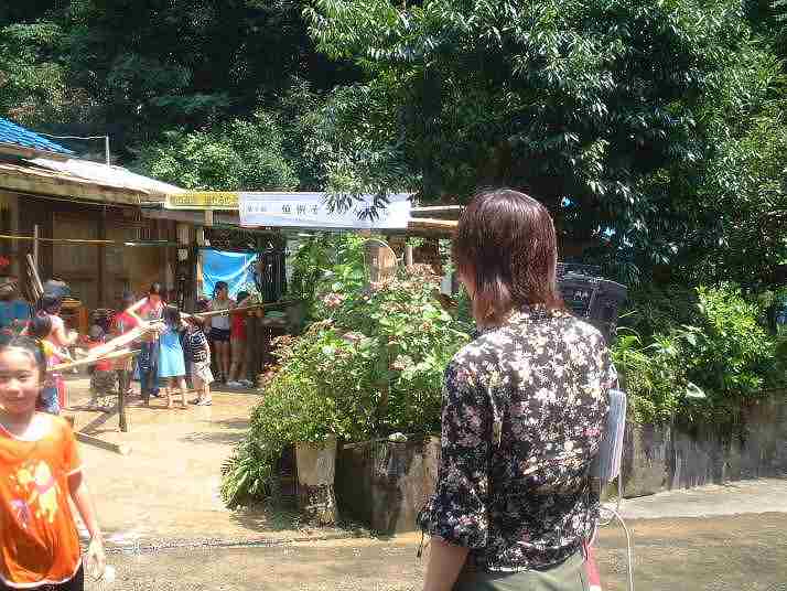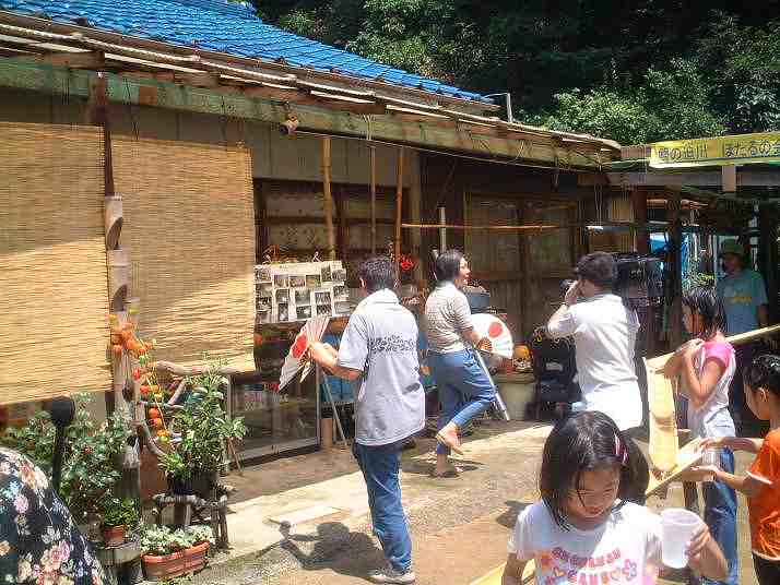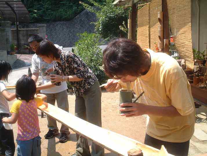 小さな子供は下流に立ちます。だからなかなかそうめんがやってこない。早くこいと お箸とそうめんツユをかまえています。4曲がり目の様子。 |