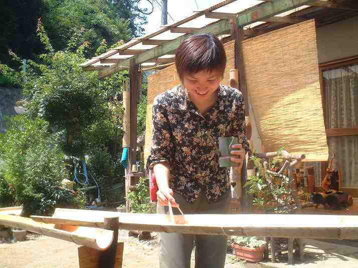 竹のお椀を手にそうめんをつかむ 西村おねえさん。(左1)
