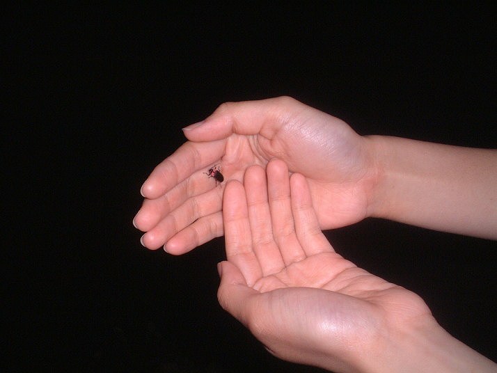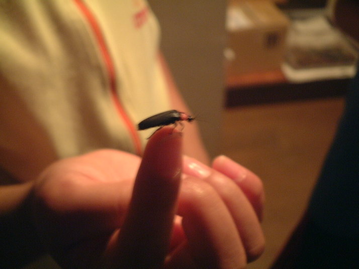 左の写真と同じ、手の上のホタル。フラッシュ無しで撮影。 |