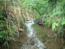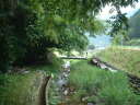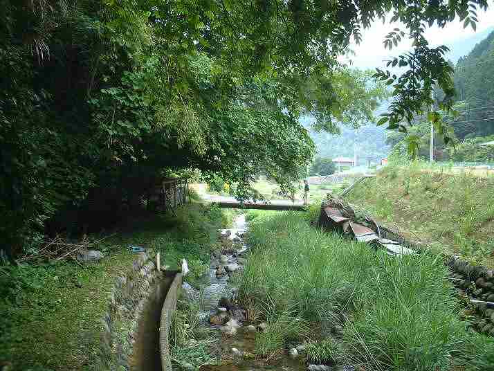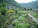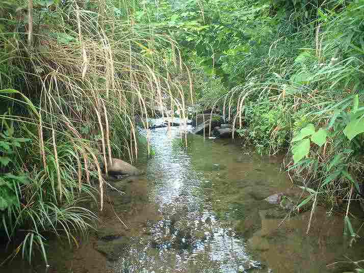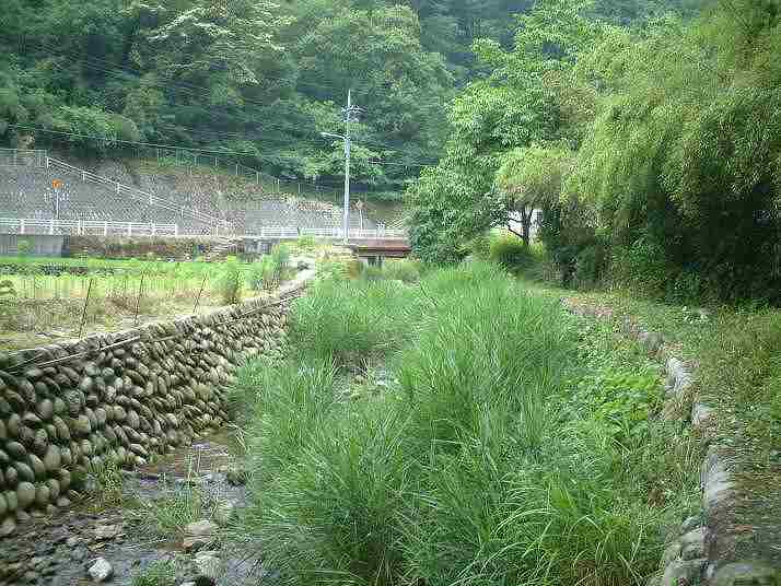 筒瀬川の棲息地A 左の左岸に太さ4cmのシマヘビ。右の上は幅2mの橋。