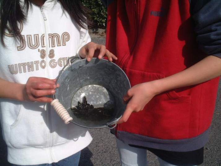 ゴム手袋をはめて 両手で石をはぐる 写真がHPに