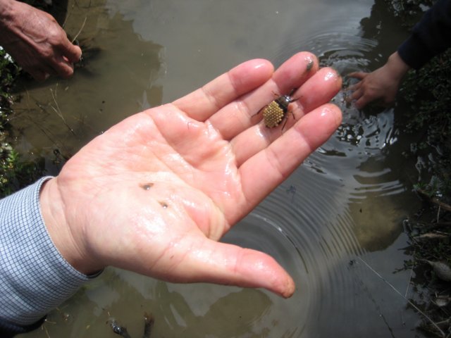 見つかった「コオイムシ」♂の背中に卵がびっしり