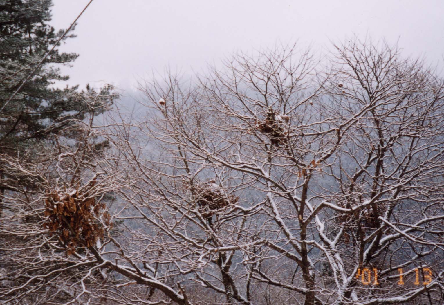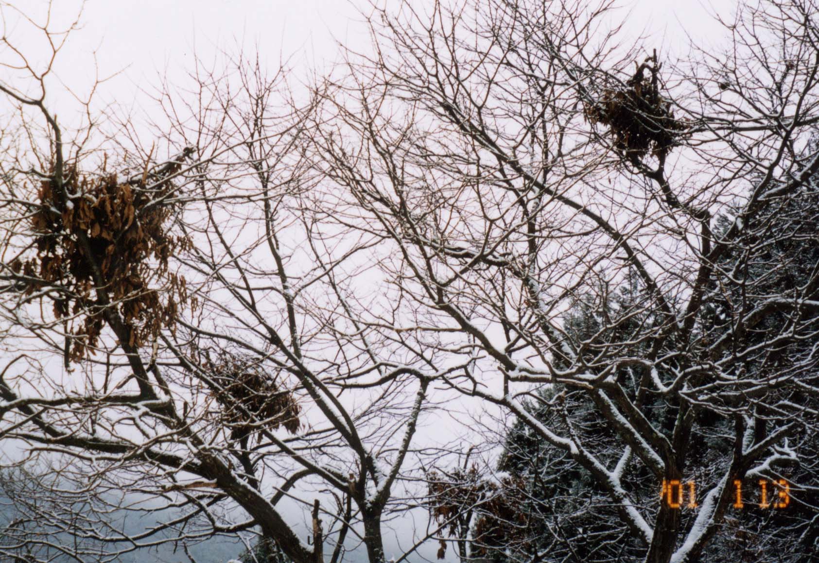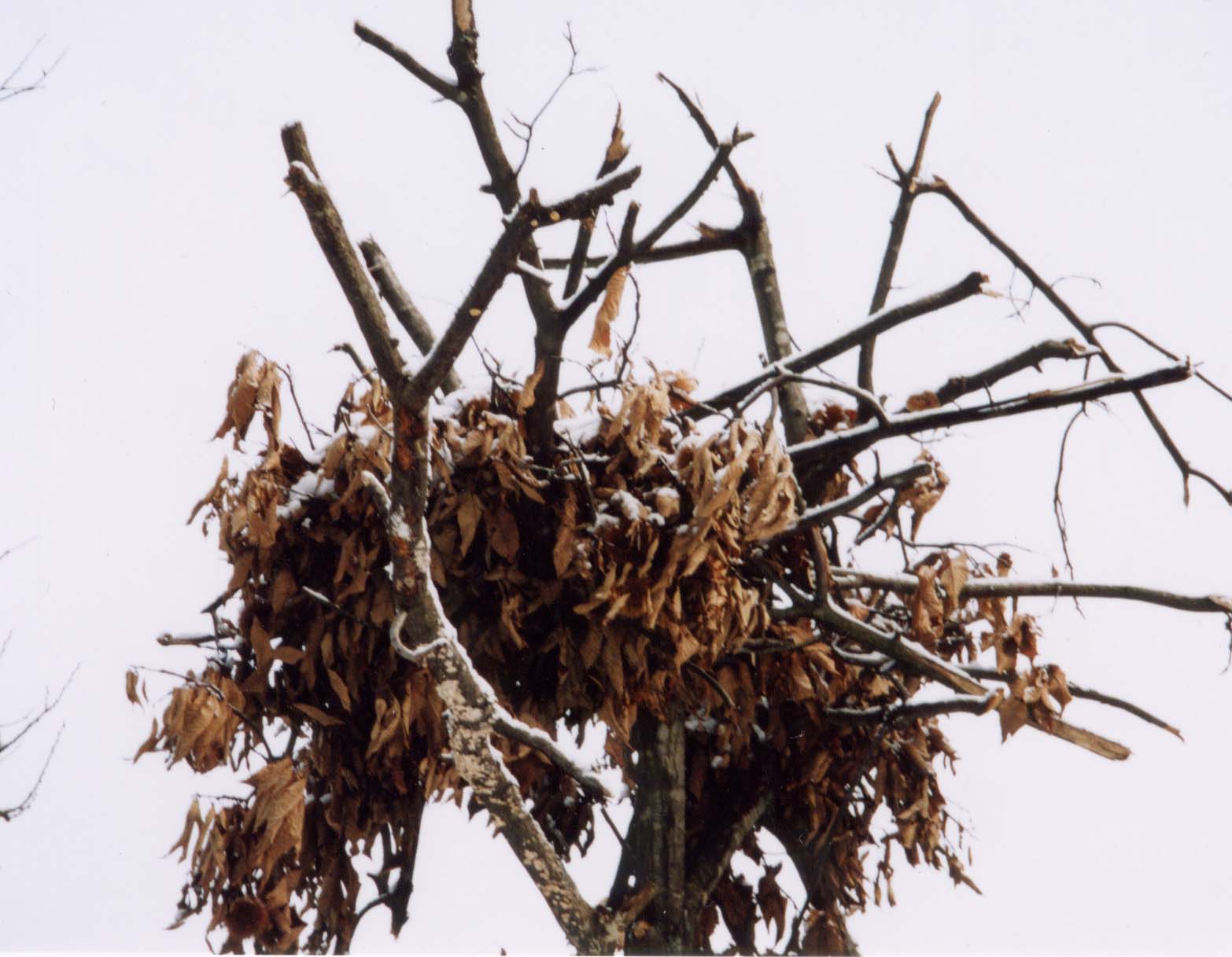 熊がここに坐ってクリの実を食べたのは、8月か9月。その時はもちろん枝には葉がたくさんついていたんじゃ。その後、秋になり冬になってすっかり落葉したのがこれじゃ。クマが枝を折って敷いた跡がはっきりと分かるじゃろ。クマが坐った枝はまだ葉が残っとろお。 熊にとってクリやブナなどの落葉樹は無くてはならない命の木なのだ。 |